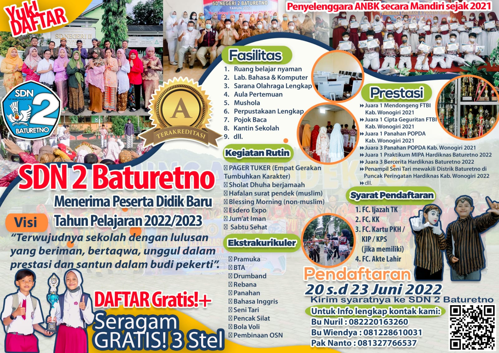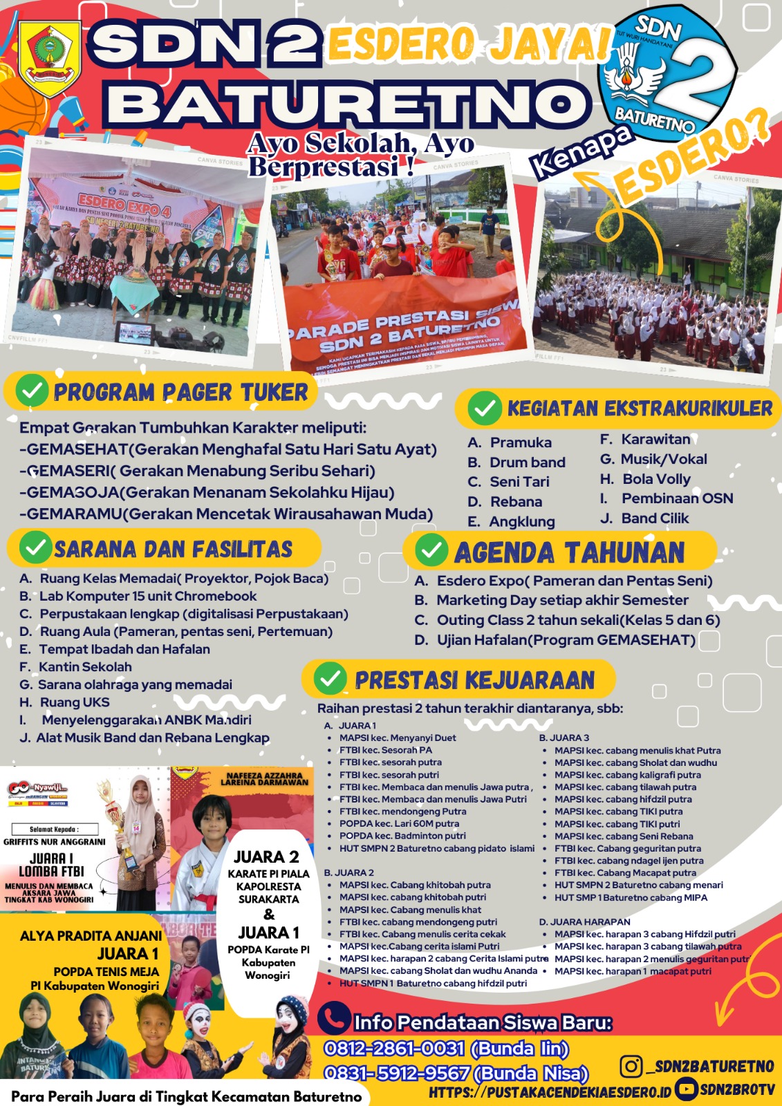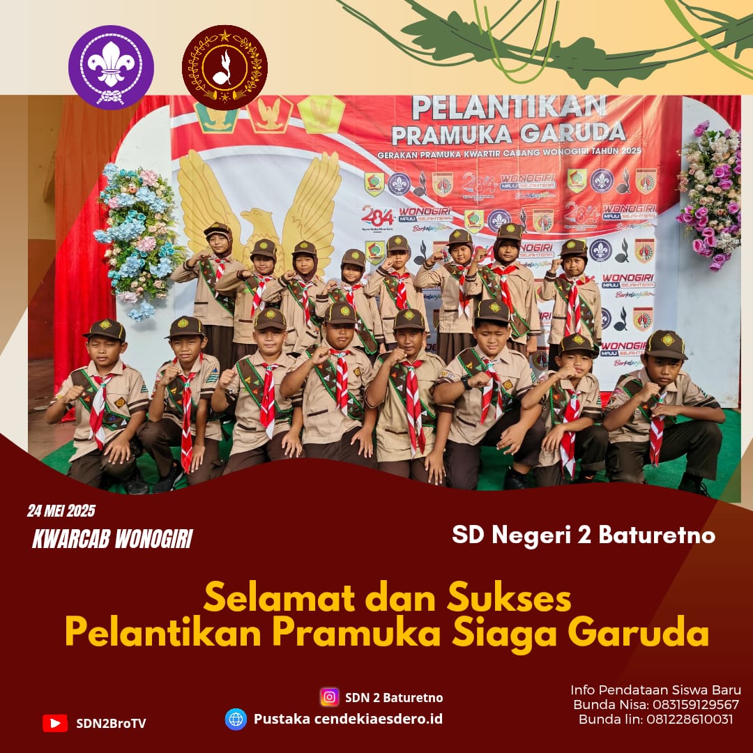 Dua barung dari SD Negeri 2 Baturetno, yakni barung biru dan barung merah, turut ambil bagian dalam kegiatan Pelantikan Siaga Garuda yang digelar di GOR Wonogiri pada Sabtu, 24 Mei 2024. Acara ini diikuti oleh ribuan siswa dari berbagai sekolah se-Kabupaten Wonogiri, baik tingkat SD, SMP ataupun SMA/K. Barung biru dan barung merah SD N 2 Baturetno yang merupakan juara 1 dan 2 pesta siaga di tingkat kecamatan Baturetno tahun 2025 ini menunjukkan semangat dan kedisiplinan tinggi selama prosesi pelantikan berlangsung. Dengan mengenakan seragam Pramuka lengkap, mereka mengikuti rangkaian kegiatan dengan antusias, mulai dari upacara pembukaan hingga prosesi pelantikan Siaga Garuda.